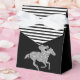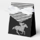 Les boîtes de faveur de fête de style tente présentent un cheval de course en paillettes argentées sur fond noir et des rayures noires et blanches en haut. Changez les couleurs de fond à votre guise ! Idéal pour une fête de Derby, une douche de nuptiale Derby, un anniversaire, une fête de retraite et plus encore. Articles CORRESPONDANTS dans notre collection.