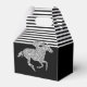 Les boîtes de faveurs de fête Gable présentent un cheval de course en paillettes argentées sur des rayures noires et blanches en haut et noires en bas - changez les couleurs de fond à votre guise ! Idéal pour une fête Derby, une douche de nubilée Derby, un anniversaire, une fête de retraite et plus encore. Articles CORRESPONDANTS dans notre collection.