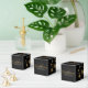 This favor gift box is printed on with Merry Christmas and Happy New Year wished in text along with a flush of snowflakes in silver and gold tones on the box on black background. Top has a large snowflake.