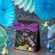 Style tente noire avec ballotin ruban violet avec une image sur le devant de plaques de peinture rouge, orange, jaune, vert et bleu, baskets haut-de-gamme dans les couleurs néon, cassettes, lunettes de soleil colorées et la phrase "Coincé dans les années 80" en lettres néon. Voir confettis assortis, sac de faveur, étiquette de faveur, sacs cadeaux, étiquette, autocollant carré, autocollant vinyle taillé sur mesure et papier d'emballage. Voir l'ensemble de la collection de Ballotins Tubulaires 80s dans les TOUCHES SPÉCIALES | Section Favoris.