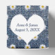 Cœur blanc avec les noms des jeunes mariés sur denim de jean bleu et motif de marguerite.