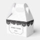 Créez votre propre emballage personnalisé pour les faveurs de mariage. Ce ballotin est prêt à être customisé avec vos noms et date de mariage à l'intérieur d'un cadre orné. L'arrière - plan blanc a un motif imitant et est accentué par mon illustration en dentelle noire.