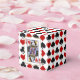This is a cute gift favor box for a variety of occasions. It features the familiar red, black, and white pattern of diamonds, hearts, spades and clubs commonly found in a deck of playing cards. The front of the box has a gold frame around the winking Queen of Hearts.