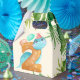 Vous aimerez ce design avec un dinosaure turquoise numéro 2 en ballons jaune-orange et orange/rouge et des feuilles tropicaux verts.