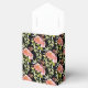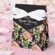 De belles fleurs aquarelles roses et rouges et une verdure élégante sur fond noir mettent en valeur ces boîtes de bonbons de mariage en forme de tente de style mariage dans un ton ruban. ARTICLES CORRESPONDANTS dans notre magasin.