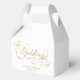 Une boîte de faveur de mariage blanche formelle et élégante avec un script de calligraphie en faux or.
