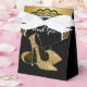 Elégant noir et or parties scintillant haute talon ballotins de chaussures. Vous pouvez ajouter du texte à l'avant et à l'arrière de cette belle boîte de faveur de soirée noir et or et choisir votre couleur arrière - plan et ruban. Ce magnifique ballotin à talons hauts noir et or est idéal pour une fête de 50ème anniversaire de femme. Le texte dit "Merci !" sur le devant et "pour avoir fait partie de ma journée spéciale !" sous le rabat du dessus. Vous pouvez modifier ou supprimer le message et choisir votre style de police.