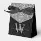 Girly Modern Elegant Black and Silver Parties scintillant Monogramme Nom initial Signature Script Personnalisé Ballotin. Ce design avec votre prénom dans un joli bloc de parties scintillant en couleur gris argent sur arrière - plan noir. Ces boîtes-cadeaux élégantes et féminines, idéales pour distribuer, cadeaux, cadeaux d'hôtes et gâteries lors d'une fête d'anniversaire à venir, barbecue, 16 ans sucrés, baby shower, réception de mariage, soirée bachelorette, douche nuptiale, anniversaire et plus encore.