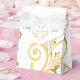 Shown is a tent style favor box in White with a fancy Golden-color printed heart pattern on it and floral-type print all over box. Embellished with a White ribbon at top. Newlyweds' names on each side of heart and the last name inside the heart.