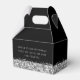 Élégante boîte de faveur de fête avec bordure parties scintillant argent et confetti arrose sur un arrière - plan noir avec XOXO personnalisé, parfait pour un anniversaire moderne et chic, bat mitzvah, Quinceañera, douche nuptiale, baby shower ou fête de bachelorette. Cliquez sur CUSTOMISER PLUS loin pour modifier les polices, les couleurs et la disposition afin de créer un ballotin personnalisé amusant et unique pour vos invités de fête.