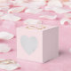 Boîte de faveur de la fête affichée en rose clair avec le cercle éternel or en haut avec les noms des nouveaux mariés à l'intérieur du cercle. image sur le dessus avant seulement. La boîte a une jolie fenêtre découpée en forme de coeur. Customisez cet objet ou achetez tel que conçu.