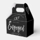 Une boîte à gable en papier blanc amusante et unique, en écriture manuscrite, spécialement adaptée à votre future fête d'engagement. Il comporte le mot "fiancé" avec des anneaux mariages se reposant sur lui. Autour de cela sont les noms de la mariée et du marié et la date du fiançailles. Vers le bas de l'avant de la boîte est un endroit pour votre message unique à vos invités.