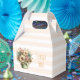 Une petite boîte à faveur avec une image mignonne. Fleurs bleues, roses et crème avec des feuilles vertes. Ensemble dans un pot de fleurs vert avec un tissu à carreaux vert suspendu sur le côté.