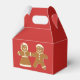 Pain d'épices avec biscuit blanc glaçant homme et couple femme se tiennent la main pour les vacances de Noël. Obtenez ce mignon couple pour rendre votre saison brillante avec une image de Noël traditionnelle sur un arrière - plan rouge vif et enjoué.