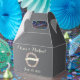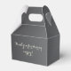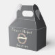 Sur un arrière - plan de tableau noir, l'avant de la boîte est ornée d'une jolie couronne fleurie en ivoire, rose et pêche et d'une bannière qui dit : "Heureusement toujours après". Les noms de mariée et de mariée et la date du mariage sont personnalisés dans une police de caractère cursive pour un ballotin amusant et élégant. Ajoutez votre propre message personnel au dos.