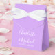 Elégant ballotin de mariage avec des noms de script signature et date spéciale dans la typographie moderne sur un arrière - plan de lavande lilas. Vous pouvez personnaliser avec votre propre message de remerciement sous le couvercle. Une façon parfaite de remercier vos invités ! Conçu par Thisisnotme©