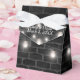 Une série d'ampoules mariages brillantes sur un mur en brique gris foncé. Les noms et la date du mariage sont modifiables.