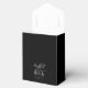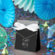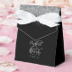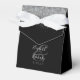 Le rabat avant de cette élégante boîte de faveur de mariage moderne comporte une bordure de parties scintillant en faux argent. Le texte personnalisable combine écriture gris argent et polices de caractères sur cuivre sur une grande carte sur un arrière - plan noir.