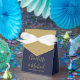 Un ballotin de mariage élégant avec des noms de signature or stylisé et date spéciale ensemble dans la typographie chic sur un arrière - plan bleu marine. Vous pouvez personnaliser avec votre propre message de remerciement sous le couvercle. Une façon parfaite de remercier vos invités ! Conçu par Thisisnotme©
