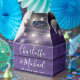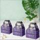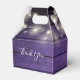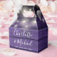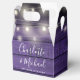 Boite de faveur de mariage rustique avec de jolies lampes à cordes, des noms de script de signature chic et une date spéciale sur un arrière - plan de panneaux de bois violet. Vous pouvez personnaliser avec votre propre message de remerciement au contraire. Une façon parfaite de remercier vos invités ! Conçu par Thisisnotme©