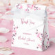 Cette boîte de faveur de mariage sous les fleurs de cerisier présente de jolies fleurs de cerisier roses sur fond blanc. Boîte botanique avec un texte de remerciement, un texte de mariage et un nom de future mariée personnalisé dans une élégante écriture calligraphique.