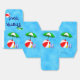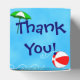 Une boîte de fête en Merci en lettres bleues amusantes sur le dessus et des balles de plage rouges et blanches, des parasols verts et des sandales sur les côtés sur un arrière - plan bleu aquatique. Cliquez sur Customiser pour ajouter votre nom ou votre message, modifier les couleurs des arrière - plans, même enregistrer votre conception pour plus tard.