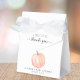 Joli ballotin de baby shower neutre pour le genre avec "merci" en typographie gris simple et un script élégant avec des swashes, et une aquarelle citrouille orange.