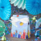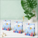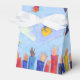 Pour une fête de remise de diplômes, ces ballotins sont décorés d'une scène de tossing coloré caps de graduation dans l'air, montrés contre un ciel bleu avec des nuages bouffants. Texte : "Merci".