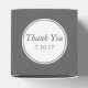 Boîtes-cadeaux à thème mariage orchidées blanches avec en haut les mots "Merci" et la date mariage en gris.