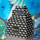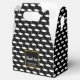 Un motif de casquettes blanches apparaît sur ce ballotin noir. Au centre il y a un carré noir avec une fausse bordure en or. A côté du carré, il y a le message "Merci" en écriture blanche et le texte blanc personnalisé qui peut être personnalisé avec le nom du diplômé et l'année de classe.