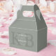 Minimalist personalized wedding favor boxes personalized with modern typography monogram initials in sage green color design.