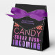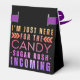 Amusant et moderne ballotin pour Halloween. Graphic dit : "Je suis juste ici pour les bonbons, le sucre se précipite à l'entrée" dans les tons orange, rose et violet. Ce ballotin peut être personnalisé sur le rabat avant.