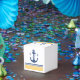 Bandes nautiques jaunes et bleu marine avec ancre et monogramme.