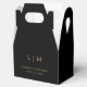 Un Ballotin de mariage simple mais élégant avec un design minimaliste moderne avec votre monogramme de deux lettres avec vos noms et votre date. Tous les éléments de conception sont en faux or sur un arrière - plan noir et peuvent être changés dans l'outil d'édition de conception. Ces boîtes de Faveur Mariage classique vont bien avec n'importe quel style de mariage.
