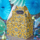 Ce ballotin présente des oiseaux, des fleurs, des abeilles et des papillons bleu marine et crème sur un arrière - plan jaune moutarde.