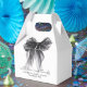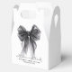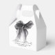 Élégantes boîtes de faveur de mariage avec un noeud papillon coquette noir aquarelle, "avec amour et remerciements" dans un script de calligraphie moderne, et le nom de la mariée et la date du mariage en lettrage simple.