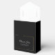 Cet élégant ballotin noir fera de votre séjour un moment privilégié. Votre Merci et votre message en écriture blanche est accentué par un bouquet classique doré et fleuri blanc avec cadre doré. Le dos porte le nom du couple avec le même cadre et l'accent floral.