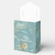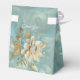 Une palette bleu clair est avant un motif arrière - plan en cuivre/bronze de style barogue. Les cartes sont décorées de fleurs crème et de feuilles dorés sur un cadre en forme de losange.