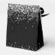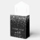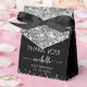 Elégant Moderne Fille Argent Parties scintillant Monogramme Nom Signature Script Personnalisé 30ème (ou tout âge) anniversaire Merci Ballotin. Ce design qui met en vedette votre prénom dans une jolie police de caractères de caractères de caractères de la queue d'écharpe (ou calligraphie) en haut de parties scintillant gris argent faux sur arrière - plan noir. Ces boîtes-cadeaux élégantes et féminines, idéales pour distribuer, cadeaux, cadeaux d'hôtes et friandises lors d'une fête d'anniversaire à venir, 16 ans sucrés, baby shower, barbecue, douche nuptiale, réception de mariage, fête de bachelorette, anniversaire et plus encore.