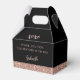 Ballotin de parties scintillant en or noir et rose avec une bordure à bande simple et minimale et texte cousu rose pour une soirée d'anniversaire moderne et élégante. Les polices, les couleurs et la disposition peuvent être changées avec l'éditeur de modèle pour créer un ballotin entièrement personnalisé pour votre invité merci et à emporter cadeaux de retour et échange de fête.