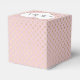 Cœur blanc avec les noms des jeunes mariés sur fond rose blush et motif de points dorés scintillants.