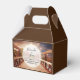 Une boîte de faveur de mariage avec une photo pittoresque. Un pont en bois qui mène à un chemin entouré d'arbres forestiers qui changent de couleur. Couché sur le dessus est un cercle semi-transparent avec une bordure en or, votre texte personnalisé à l'intérieur.
