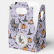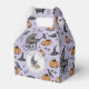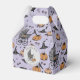 Ce ballotin d'événement Custom Halloween, artistique mais élégant, présente des illustrations dessinées à la main à l'encre noire par Nathalie Portet. Le nom, l'événement et la date personnalisés sont imprimés des deux côtés. Contre un arrière - plan violet pastel, des images de poussettes victoriennes vintages, de casquettes sorciers, de corbeaux noirs, de citrouilles, de toiles d'araignée, de chaudrons-chauves-souris et de minuscules champignons mouchetés ornent cette boîte de la fête. Un cadre circulaire présente votre salutation personnalisée ("Merci" peut être remplacé par "Happy Halloween, Félicitations, Happy 1st Birthday", etc.) Nom et date. Idéal pour les Baby showers d'Halloween, 1er Halloween, 1er Anniversaire, Bébé d'Octobre, Nouvelle Mère, etc.