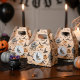 Ce ballotin d'événement Custom Halloween, artistique mais élégant, présente des illustrations dessinées à la main à l'encre noire par Nathalie Portet. Le nom, l'événement et la date personnalisés sont imprimés des deux côtés. Contre un arrière - plan orange pastel, des images de poussettes victoriennes vintages, de casquettes sorciers, de corbeaux noirs, de citrouilles, de toiles d'araignée, de chaudrons-chauves-souris et de minuscules champignons mouchetés ornent cette boîte de faveur de fête. Un cadre circulaire présente votre salutation personnalisée ("Merci" peut être remplacé par "Happy Halloween, Félicitations, Happy 1st Birthday", etc.) Nom et date. Idéal pour les Baby showers d'Halloween, 1er Halloween, 1er Anniversaire, Bébé d'Octobre, Nouvelle Mère, etc.