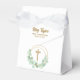 Une croix de parties scintillant en faux or et une couronne de feuilles d'eucalyptus mettent en valeur ces ballotins de style de tente de fermeture ruban avec votre texte en lettrage chic. Parfait pour la première communion, baptême ou baptême de votre enfant. Objets CORRESPONDANTS disponibles dans notre collection.