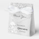 Elégant, classique, glamour et girly pour une Quinceañera, fête du 15ème anniversaire favorise. Un arrière - plan faux argenté avec des confettis et une robe. Avec le texte : Quinceañera et Merci écrit avec un script de style moderne écrit à la main. Personnalisez et ajoutez un nom et une date.