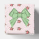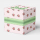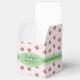 Cottage chic mariage boîte de faveur fait dans un beau motif rose et blanc rayé avec roses roses, avec des graphiques d'un arc satiné vert, sur le dessus, et ruban, autour du milieu de la boîte. Une plaque de texte ovale verte et blanche, sur le devant, a un texte personnalisé noir prêt à être personnalisé. Jolie petite boîte cadeau pour bonbons et tout ce que vous voulez donner à vos invités.