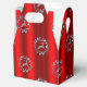 Une boîte cadeau de Noël rouge colorée avec un motif argenté de rennes d'argent à l'intérieur de couronnes de Noël argentées, éparpillé sur un arrière - plan rouge écarlate pour ajouter une touche sophistiquée et classe à votre cadeau donnant ces vacances.