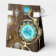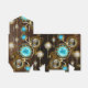 Turquoise lenses with antique watch with brass gears and golden keys on rusty, brown background. Steampunk style.