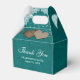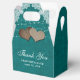 Mettez vos cadeaux de mariage ou de douche nuptiale dans ces ballotins turquoises romantiques et rustiques avec dentelle fleurie blanche et lampes à cordes sur un arrière - plan burlap.